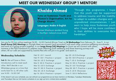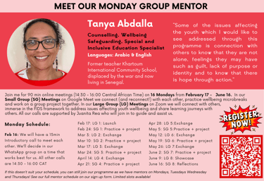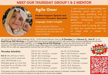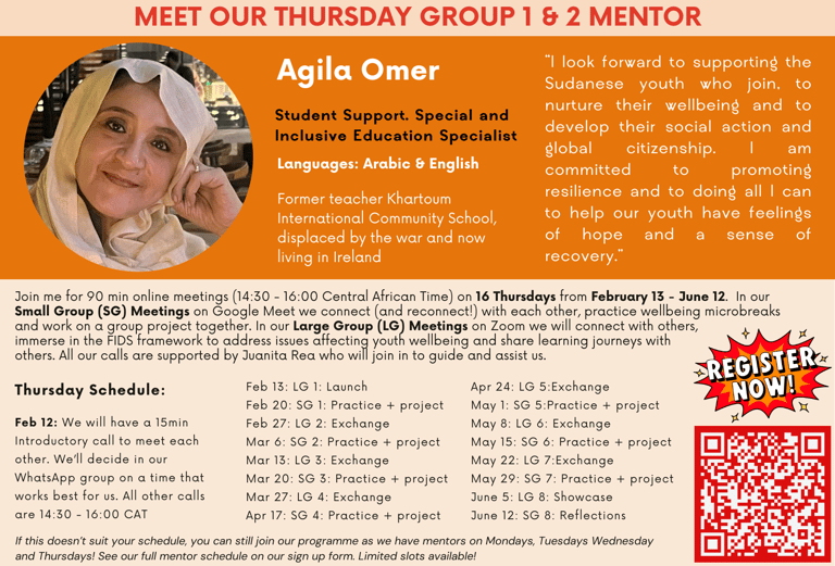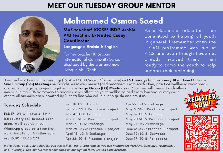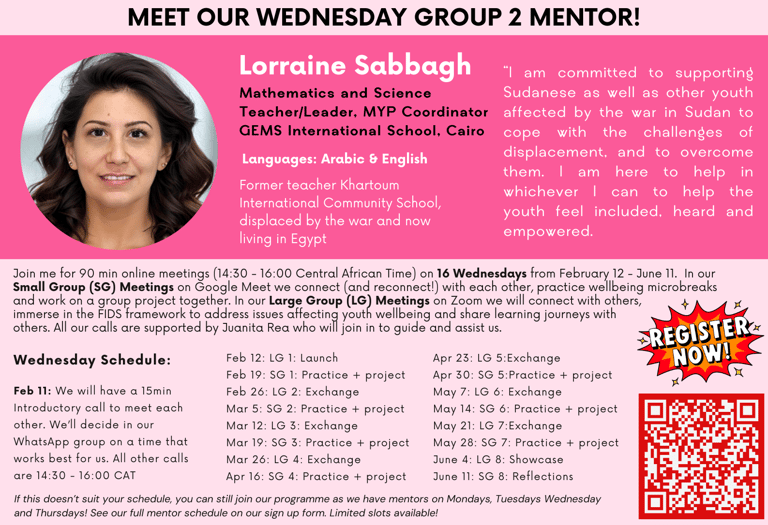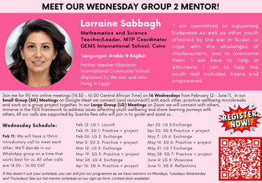 We have Agila Omer, Tanya Abdalla and Lorraine Sabbagh, Mohammed Osman and Juanita Rea all former teachers at Khartoum International Community School who will be online mentors for youth who sign up individually and form groups.
