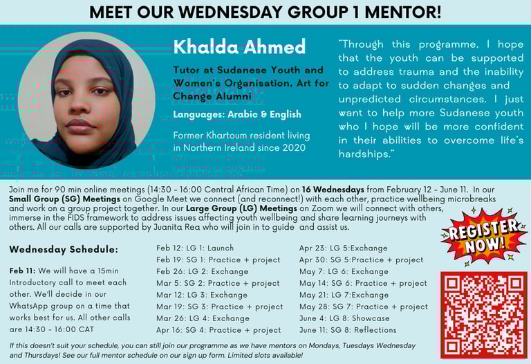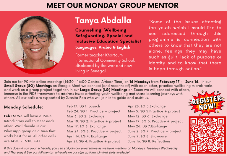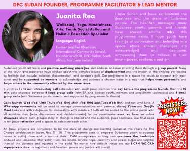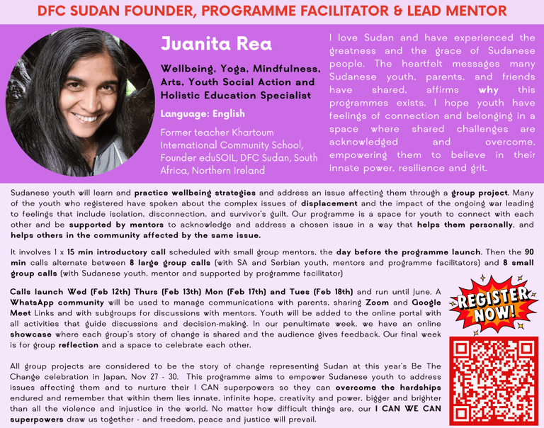 The I CAN Virtual Youth Exchange will empower 30 Sudanese youth (13 - 18 years) to nurture their wellbeing, agency, social action and global citizenship through an intercultural exchange with peers from South Africa and Serbia. This is a free, fully funded programme supported by Erasmus+ European Commission. Youth who join will reconnect with friends from Sudan, connect with new Sudanese friends sharing similar experiences and have a space to address issues affecting their wellbeing through wellbeing micro-breaks and by leading social action projects using the FIDS (Feel-Imagine-Do-Share) framework. In each series of 16 online mentorship calls, 8 large groups calls are co-facilitated by DFC Sudan/South Africa Founder Juanita Rea and 8 small groups calls are facilitated by a Sudanese, Arabic speaking teacher.